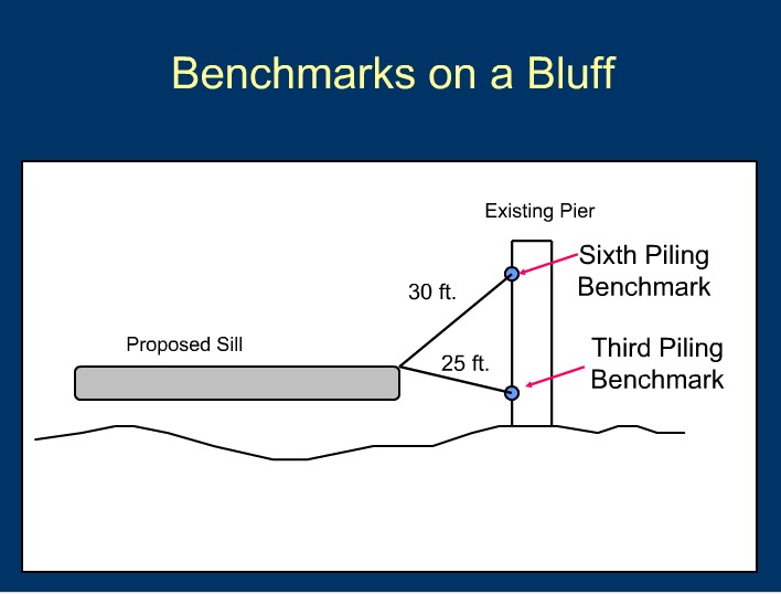 Benchmarks on a bluff can be a challenge. Use a permanent, fixed structure along the shoreline such as a pier, if present.