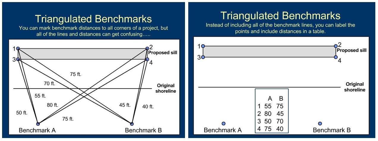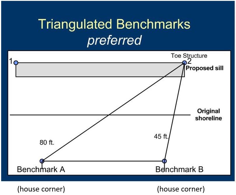 Triangulated benchmarks are preferred, where a specific point at the toe of a structure is referenced back to two or more benchmark points.