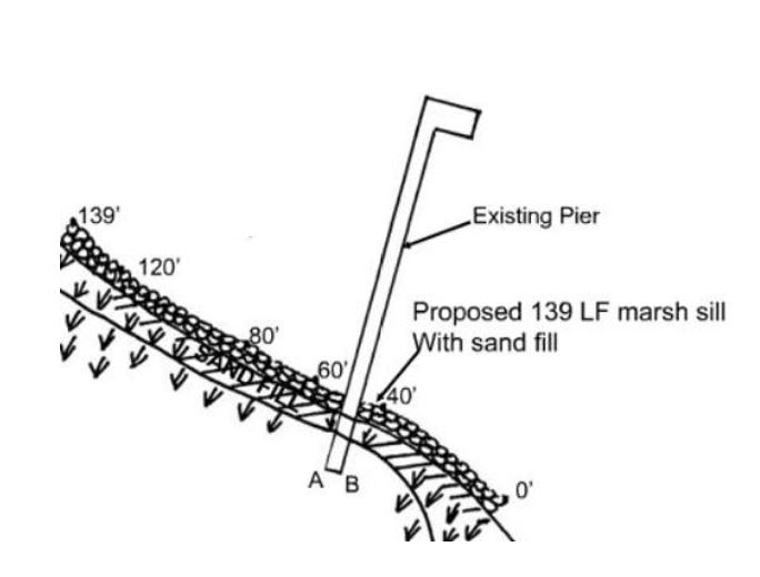 100 LF of class 1 stone sill is proposed channelward of an existing marsh. 35 cubic yards of sand nourishment is to be placed landward of the sill to augment the marsh. Approximately 250 square feet of sand area will be planted in spartina alterniflora (sprigs to be planted on 1 feet centers). No tree clearing or grading will be required. Access to the site will be through the driveway to the back yard.