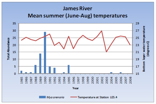 M. arenaria are temperature-sensitive and the southern limit of their range is controlled by the upper water temperatures. Temperature influences growth and reproduction. In the Chesapeake Bay, M. arenaria does not usually survive temperatures above 28 degrees C. High temperatures during the fall spawning season may be particularly harmful to the population. Ideal spawning temperatures range from around 10-14 degrees C in the spring (May-mid June) and 12-15 degrees C in the fall (late August-December). Data for populations are from Chesapeake Bay Baywide Benthic Datasets; data for water temperature are from Chesapeake Bay Institute Water Quality (1985-1982) and Chesapeake Bay Program Water Quality (1984-present)