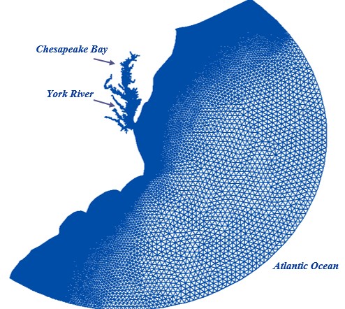 One of the strengths of this model is that it uses an unstructured grid for the simulation. This type of grid allows multiple resolutions over the domain, and higher resolution where fine scales are important.