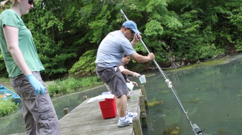 BK Song joins with graduate student Ann Arfken (L) and marine scientist Marta Sanderson (R) to collect water samples from an over-fertilized lake for analyses of microbial communities and nutrients..