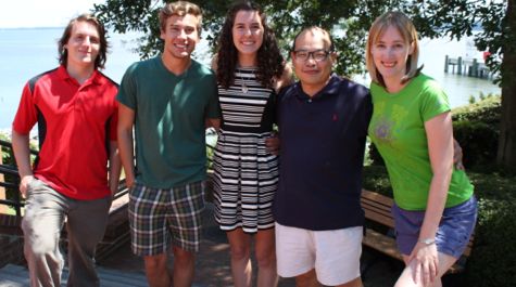 VIMS assistant professor BK Song (2nd from R) has jumped right into the academic program at VIMS. Here he poses with REU students John DeRosa and Chris Lynum, Governor's School student Madeleine Guyant, and graduate student Ann Arfken.