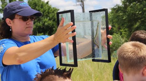 • Seining   Volunteer Caroline Herath catches an American eel while seining with a group of students.   © S. Maples/VIMS.