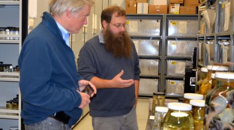 • Fisheries Collection   Professor Eric Hilton talks with a guest during a tour of the VIMS Fisheries Collection.   © S. Maples/VIMS.