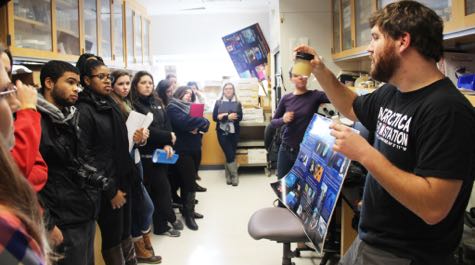 • Group Tour   Graduate students Brandon Conroy and Jami Ivory interact with students during a tour of the Zooplankton Ecology Lab.   © S. Maples/VIMS.