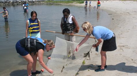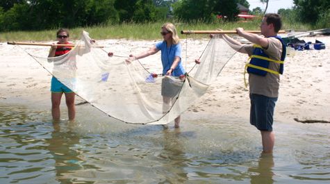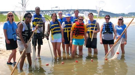 The interns’ final activity was a dip in the York River—much welcome given the 103° heat index—where they used seine and dip nets to collect and observe local marine life before returning it to the shallow water.