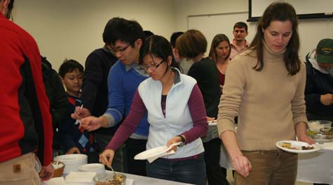 VIMS Ph.D. student Zhengui Wang joined forces with visiting researcher Fei Ye to conjure up a fried-beef mixture and potatoes tossed with red peppers—a typical dinner for the pair in their native Jilin province of China. Other dishes featured at the dinner were Japchae (Korean dish made with sweet potato noodles stir fried in sesame oil), and käse spätzle (German egg dumplings with cheese).