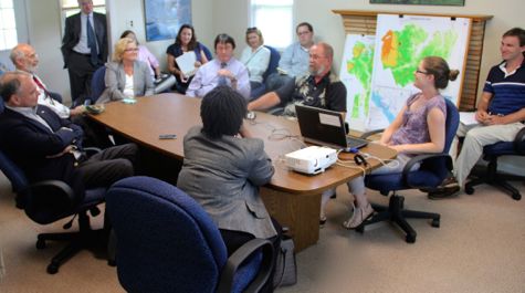 Kaine and his staffers then visited VIMS’ Center for Coastal Resources Management, where Professor Carl Hershner and researcher Molly Mitchell discussed the science behind projections of an accelerating rise in sea level for the region, the online tools they’re developing to help visualize and combat the threat, and their collaboration with the W&M Law School in helping local governments frame an effective response.
