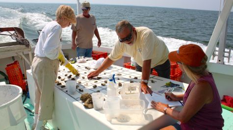 • Survey Work   Volunteers help count the relative numbers of oysters, mussels, and other organisms collected from an oyster reef in Maryland's Choptank River, a tributary of Chesapeake Bay.   ©Lisa Kellogg/VIMS.