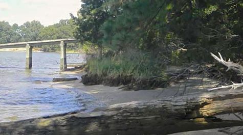 • Threatened Pier   The area of greatest concern along the Werowocomoco shoreline is a 300-foot stretch bisected by an existing pier. Erosion in this section threatens the connection between the pier and the bank. A small remnant of the once large fringing marsh is seen on the shoreline.   Photo courtesy of Donna Milligan.