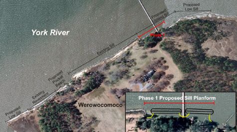 • Project Plan   Conceptual plan for protecting and preserving the archeological core at Werowocomoco using a living shoreline.   Image courtesy of VIMS Shoreline Studies Program.