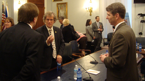 • Advisory Service   Roger Mann, one of VIMS' most prolific oyster researchers, regularly briefs advisory bodies on issues related to oysters and other marine life. Here he speaks with Rep. Rob Wittman, R-Va., following a House briefing.   © Adam Anthony