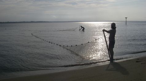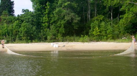 The VIMS Juvenile Striped Bass Seine Survey currently samples 18 stations in the Rappahannock, York, and James River watersheds. Biologists sample each site five times from early July through mid-September of each year. At each site, they deploy a 100-foot seine net from the shore and count and measure every netted fish before returning them to the water. These young striped bass generally measure between 1.5 and 4 inches (40 - 100 mm) long. Survey scientists in Virginia measured 1,883 juvenile striped bass at these stations in 2015. VIMS has been conducting the survey annually since 1967 for the Virginia Marine Resources Commission.