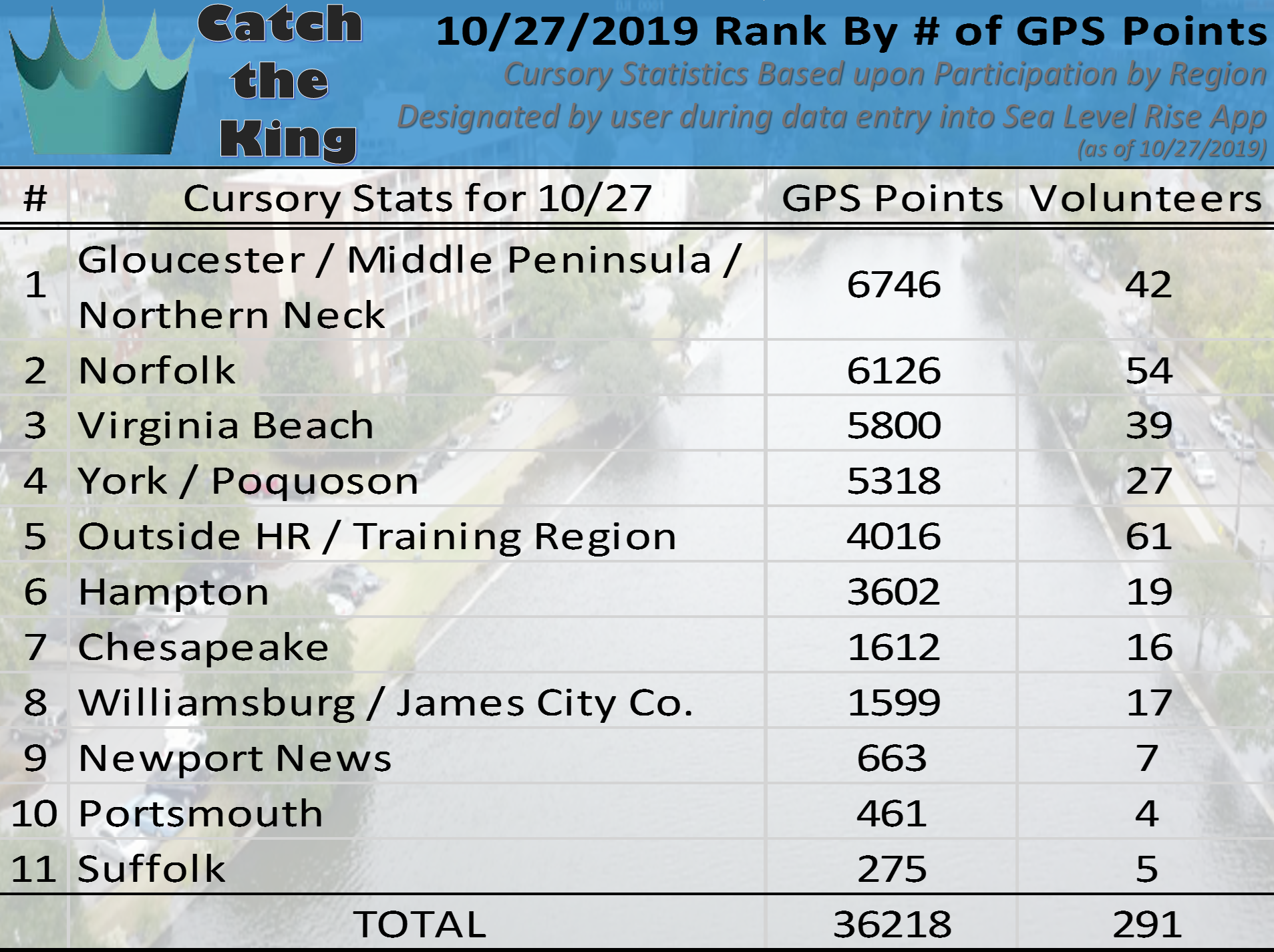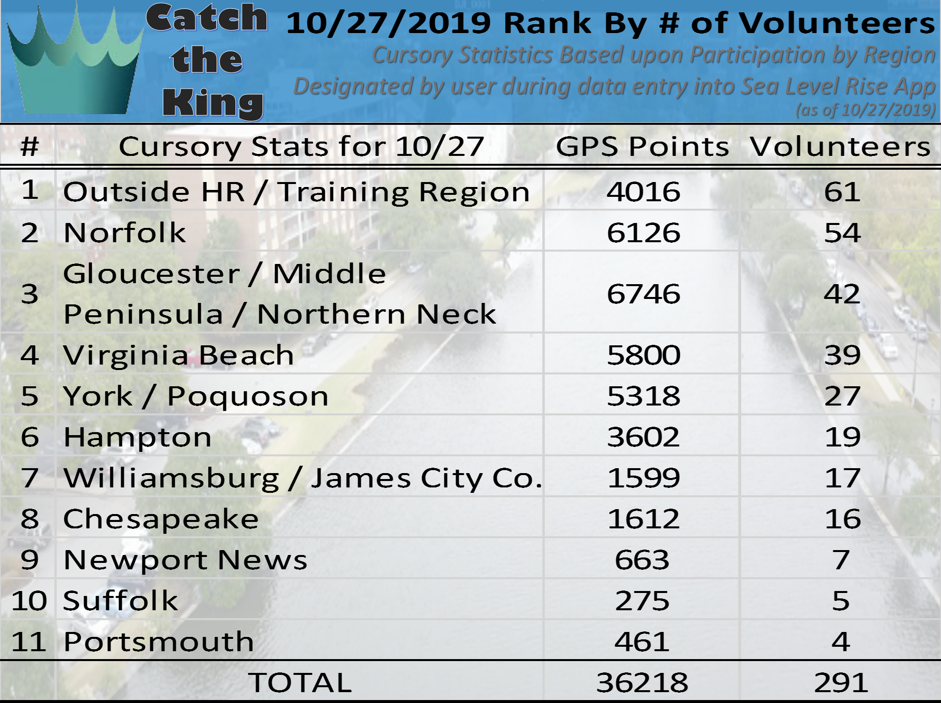 The volunteer breakdown for Catch the King in 2023 revealed that the Northern Neck region of VA collected 3,609 GPS-recorded high water marks among 29 volunteers. Many of our community scientists in this region are Master Naturalists and Master Gardeners, so a special thank you goes out to these groups of diligent volunteers who helped collect data in new places in rural tidewater VA. Volunteers in Norfolk and VA Beach came in a close second/third by collecting ~2275 high water marks each. Thank you to our dedicated volunteers for your help in mapping the king tide this year!