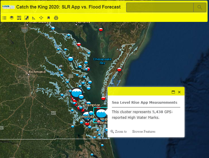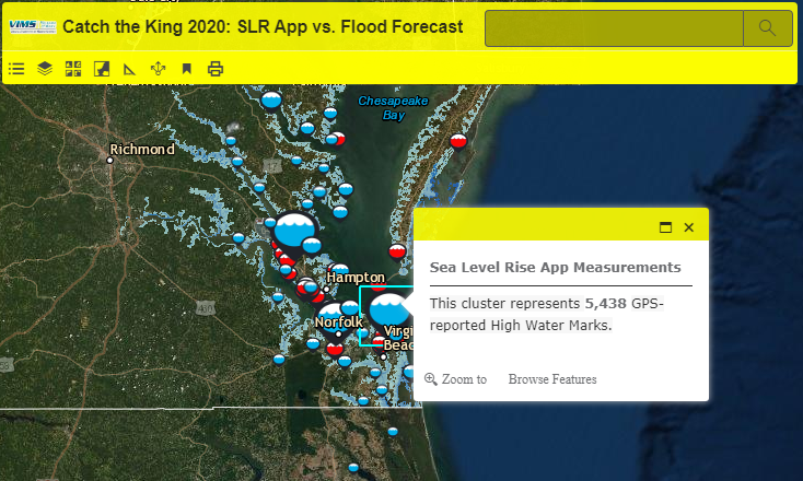 - The blue flood layer is superposed with satellite imagery on this interactive map represents forecasted maximum flooding extents for the King Tide happening in Hampton Roads on 10/27-29/2022, from 8:00 AM - 3:59 PM EDT, with the Sea Level Rise App data serving as an effective validation of the model's predictions. This layer represented inundation extents predicted by VIMS' models months before the king tide event. These tidal inundation forecast results are then updated days before Catch the King to account for near-term weather-related impacts on the king tide as a comprehensive storm tide forecast using a range of blue hues corresponding with flood depths, and are advised by VIMS' hydrodynamic models and by Tidewatch.
