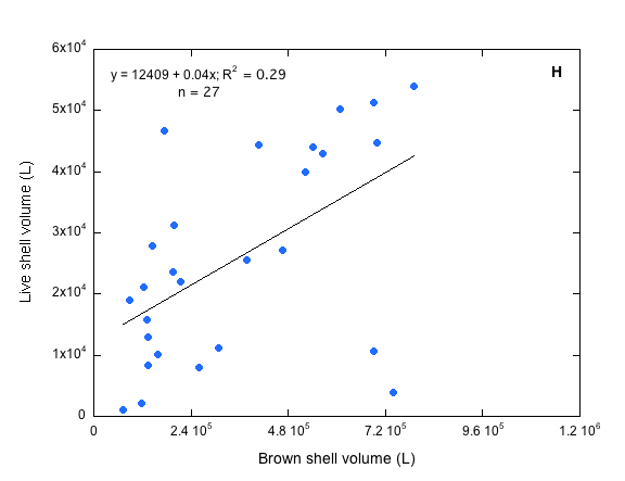 Figure 5H. Brown shell volume (L) versus live shell volume (L) in the Elizabeth and Lafayette Rivers (region H).