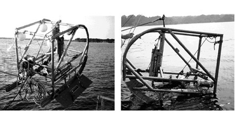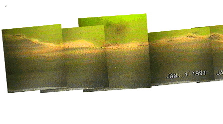 The image displayed above is a compilation of digitized versions of the video sequence taken 2/22/96 from the York River, Virginia. The video was recorded on Hi-8 tape, and the lighting was supplied by a 12V/20W bulb. The video system was powered by a standard marine battery on the vessel, and zoom and focus were controlled from the vessel. Remote control and power are achieved through a 400 ft. long underwater cable. Sled tow transects are continuously logged on the vessel as GPS coordinates. A water quality sensor system (Hydrolab Datasonde) attached to the sled allows continuous acquisition of water depth, temperature, salinity, dissolved oxygen, and pH. Additional video and still cameras have been be affixed to the sled and have successfully provided close-up plan-view and oblique-view images of the sediment surface.