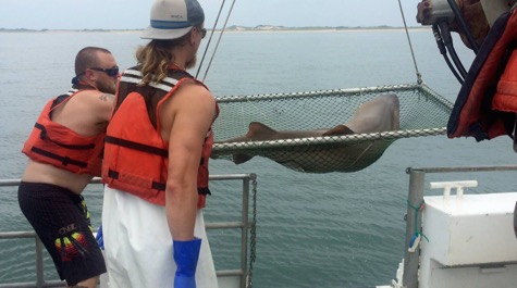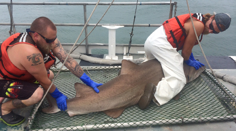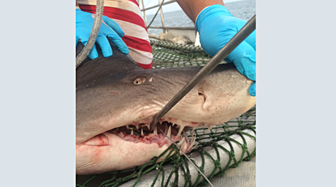 • Dehooking   Dehooking a sand tiger (Carcharias taurus) aboard the RV Bay Eagle. The shark will be weighed, measured, and tagged before its release back into the water.