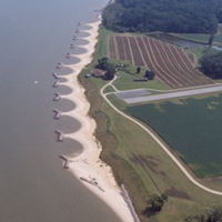 Single property owner desired system like the Van Dyke project. The system was designed using shore evolution and a Mb:Gb relationship of 1:1.65. Archaeological resources also were a factor in project design as well as upland drainage and interfacing with downdrift shore. The 3,000 ft system was installed 1998. Thirteen headland breakwaters as well as a revetment and spur on upriver boundary and a low, interfacing breakwater on downriver boundary were constructed. Beach fill was obtained from upland borrow pit. Wetlands plantings and bank grading also occurred. Two archaeological sites had to be protected using bank fill instead of grading which pushed the system out at those points.